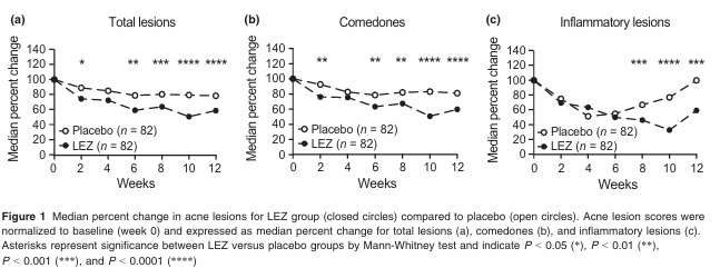 아연, 락토페린, 비타민 E 복합체는 피지 생성 기전에 관여하여 여드름 병변을 감소시킵니다. 이중맹검 임상 시험에서 해당 복합제는 총 병변 수를 유의하게 감소시켰습니다 [4].
